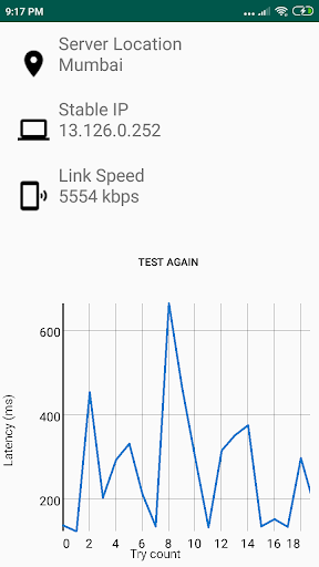 The application also checks for the stability to the server with least latency. This is to ensure that the connection established has low latency over a period of time. 1-2 spikes of high latency might be acceptable, though more spikes of high latency ( >300ms) might not provide a good gaming experience to the user.