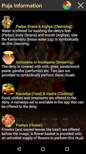An auto/demo puja mode is available if you wish to just pray while the various puja rituals are being performed as if by a virtual temple pujari (priest)!