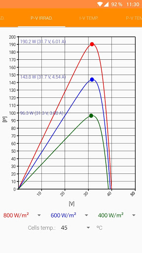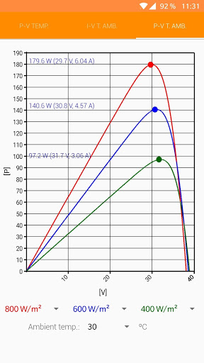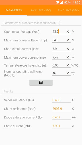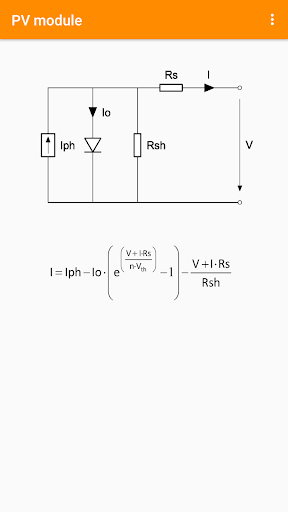 'PV module' solves the simplified equation of the photovoltaic module with a single exponential and five parameters, from the test data (Voc, Vmp, Isc, Imp) of the photovoltaic panel under standard test conditions (STC: 1000 W/m² of irradiation, 25ºC cell temperature, spectrum AM 1.5g) provided by the manufacturer.