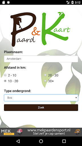 - ‘zoek routes’, zoek een geschikte route om te rijden. Je kunt zoeken op afstand, locatie en ondergrond (bos, heide, duinen, strand, openbare weg en overig).