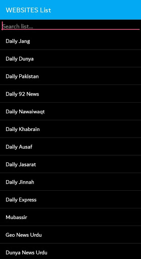 The news websites include Daily Jang, Daily Dunya, Daily Pakistan, Daily 92 News, Daily Nawaiwaqt, Daily Khabrain, Daily Ausaf, Daily Jasarat, Daily Jinnah, Daily Express, Geo News Urdu, Dunya News Urdu, Samaa News Urdu, Javed Chaudhry News, Hassan Nisar News, Hum Sub News, Express News Urdu, BBC Urdu, Daily The News, Daily The Express Tribune, Daily The Nation, Daily Dawn, Daily Pakistan Today, Daily Business Recorder, Daily The Patriot, Daily Times, The Financial Daily, Daily Pakistan Observer, Pakistan Telegraph, Geo News, Dunya News, Samaa News, The Friday Times, Mubassir, Kashmir Media Service, Kashmir Watch, Urdu Point, among other websites.