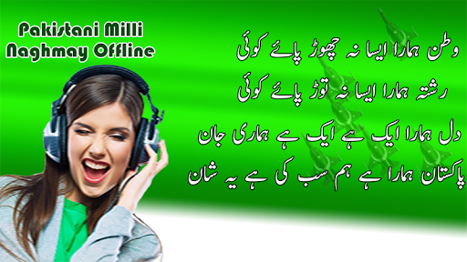 The Pakistani Milli Naghmay (National Songs) Offline app is composed to show regard for country on all special occasions like Pakistan Day & Independence Day.Mp3 national Songs like Pak Army songs, Pakistan day track, Independence Day melodies, and PAF and Navy songs in voices of classy singers. Most famous and new milli naghmay Audio National songs especially for Pakistan independence day and Pakistan day and also enjoy Army songs on Defense day. Listen and enjoy most new emotional Audio Tracks and share with your friends and celebrate National day.