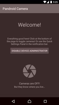 Pandroid Camera disables and reenables your devices cameras at your will. If you deactivate your device cameras using this app, no app can access cameras.