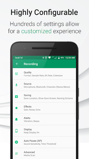 • Effects: Use Android’s built-in recording effects to remove background noise, cancel out echo and automatically control gain. For those situations where more power is needed, set your own custom gain.