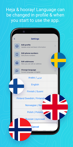 The app supports languages such as Norwegian, Swedish, Finnish, English, Polish, Russian and Arabic.