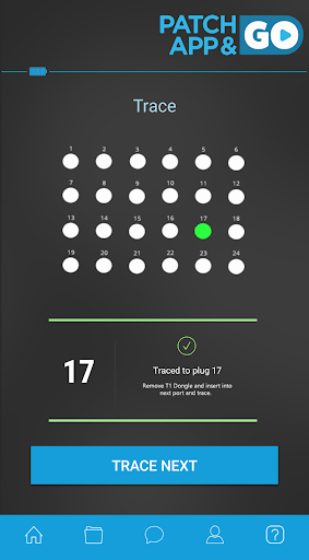 Patch App & Go can be used to trace unidentified or unlabelled data ports. By inserting the Smart Remote Plugs into the ports of the Patch Panel, Patch App & Go will send a trace from the Wall outlet, through the data cable to the uniquely numbered Smart Remote Plug, activating its LED and displaying the plugs ID on the app.