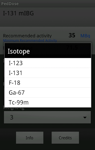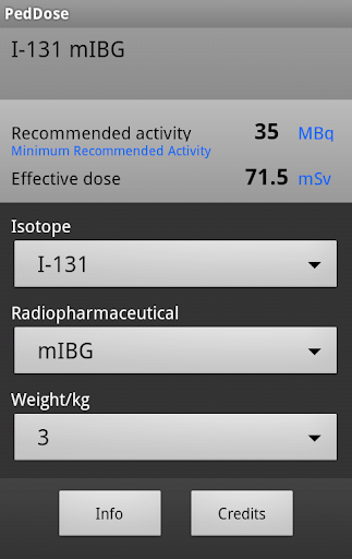 PedDose is an App version of the EANM Paediatric Dosage Card. It is intended as a guidance for Nuclear Medicine Physicians and Physicists, in order to determine radiopharmaceutical activity to inject to pediatric patients.
