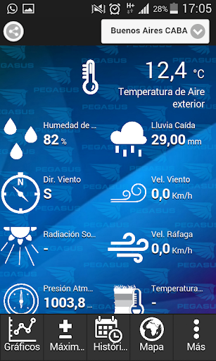 Pegasus Mobile le brinda lecturas precisas sobre datos de temperatura, humedad, dirección de viento, precipitaciones, gráficos comparativos, máximas y mínimas, datos históricos y mucho más.