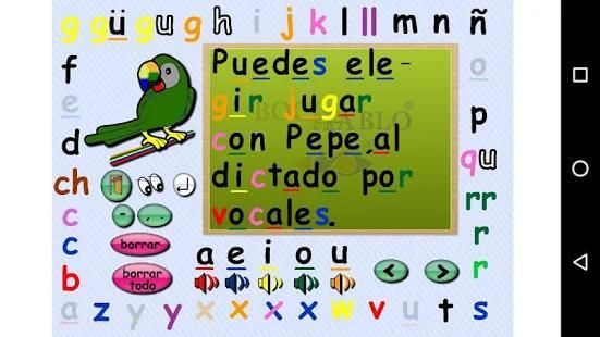 En esta aplicación aparecerá un ave audaz que, con sólo tocarle el pico, te dictará una serie de 2 o 3 vocales, que escucharás o podrás ver. Cuando estés en un ambiente ruidoso o lugar donde se deba guardar silencio, no podrás jugar en altavoz. Cuando se juegue así, se deberá bloquear el sonido para no distraer a nadie. Las letras pronunciadas por Pepe irán creciendo paulatinamente para poderlas visualizar.