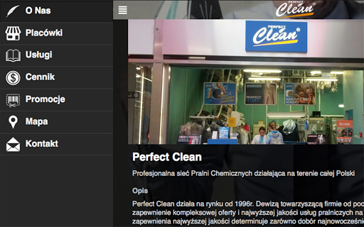 Perfect Clean działa na rynku od 1996r. Dewizą towarzyszącą firmie od początku działalności było zapewnienie kompleksowej oferty i najwyższej jakości usług pralniczych na polskim rynku. Strategia zapewnienia najwyższej jakości determinuje zarówno dobór najnowocześniejszych urządzeń i technologii, najskuteczniejszych preparatów, jak również systematyczne szkolenia personelu, szeroko rozwinięte procedury kontrolne i spójne zasady obsługi klienta i świadczenia usług. Oprócz standardowego zakresu usług: czyszczenia chemicznego oraz prania wodnego, oferujemy Klientom szereg usług dodatkowych jak: czyszczenia i renowacja odzieży skórzanej, pranie sukien ślubnych, kołder, poduszek, narzut, firan i zasłon, dywanów, pranie pościeli i magiel. Polecamy także usługi ekstra, które podnoszą walory użytkowe odzieży, chronią ją i zapewniają dłuższą świeżość: apretura, impregnacja, prokolor, Perfect Suit i Perfect Coat. Dbamy o atrakcyjność naszej oferty i konkurencyjność naszych cen.