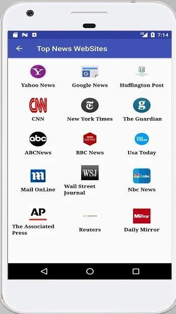 2-News Section :Yahoo News , Google News , Huffington Post , CNN , New York Times , The Guardian , ABC News , BBC , Usa Today , Mail online , Wall Street Journal , Nbc , The Associated Press , Reuters , Daily Mirror