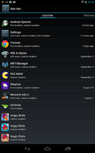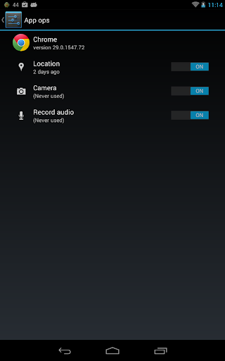 Launch also the hidden "App Ops Settings" permission screen in android 4.3 & 4.4/4.4.1 KitKat to manage individual permissions for your applications... (hit the star on the menu bar)