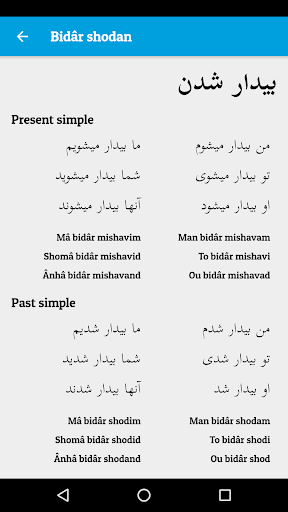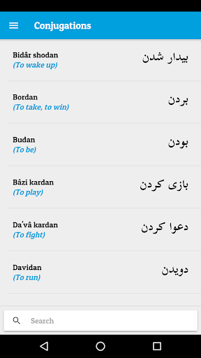 Persian verbs provides an alphabetical list of the most common verbs in Persian (Farsi) with their conjugations in all tenses. You can scroll down the list or search for a verb either through the Persian script or its transliterated version in English. Translations in English are also provided. The verbs can be re-ordered alphabetically in Persian, English or the transliterated version.