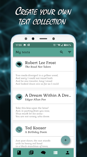 The application teaches that by dividing a large task into small subtasks, and moving towards the goal with small but confident steps, you can go a long way. After some time you will remember hundreds and thousands of lines of your favorite writings, you will be able, by way of your will, to fill your memory with everything and just as easily to take everything that you put there. Devoting little time to this technique every day, you can achieve incredible results and enjoy lessons.