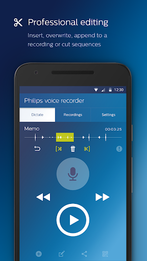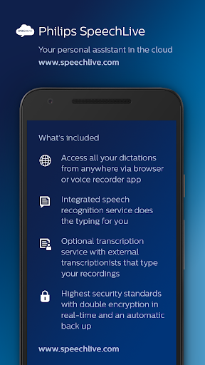 The Philips voice recorder app offers first-class recording quality, professional functions such as inserting or cutting sequences, and an intuitive operation. Recordings can be easily sent via email, Dropbox, Google Drive, etc. For maximum security, browser-based file management and additional services such as speech recognition, we recommend the use of our convenient Philips SpeechLive service.