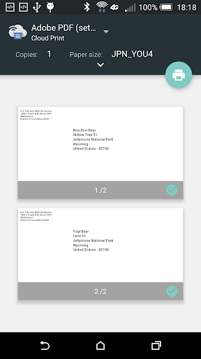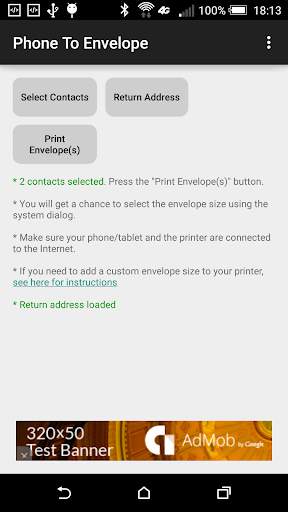 The app prints one address per envelope; in the middle of the envelope, and the return address on the top-left.