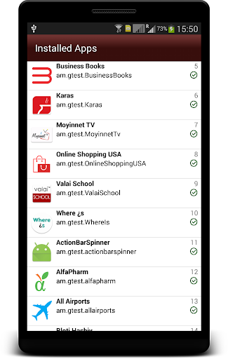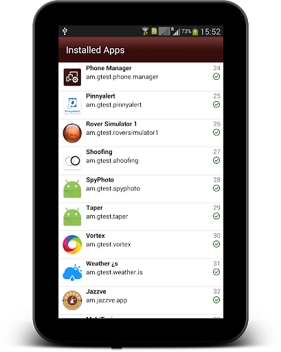 At "installed apps" section you can see all installed apps, sometimes more than you can see from your device usual means. You can sort installed apps by name, package name, being turned on/off, and availability to click to open app ( ">" icon).