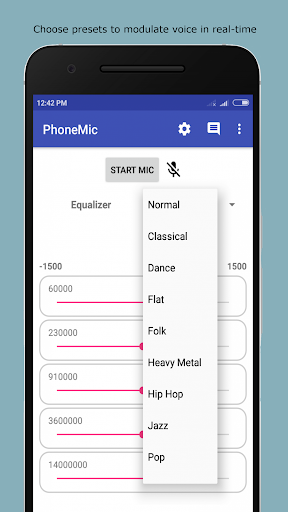 Connect you phone to a loudspeaker via bluetooth or mobile jack. And your mobile would convert into a Mic/Microphone. There is equalizer support in the app to modify some frequency components of your speech. You can also choose from given presets like Jazz, Pop, Rock, etc.