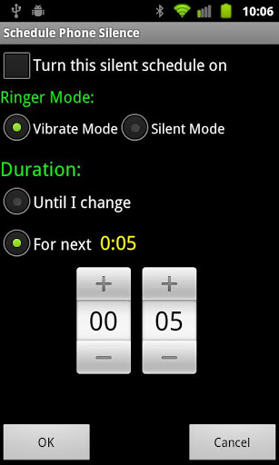 This app provides a quick and easy way to turn the phone to either vibrate or silent mode. It also lets you schedule when to turn the ringer on or off during certain days of the week, so once you set it, you will never need to worry about your phone ringing in middle of something or the phone not ringing because you forgot to turn the ringer back on.