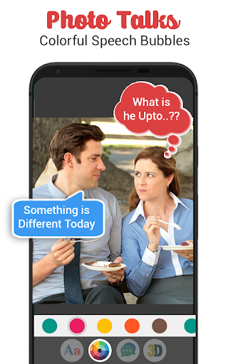 Photo talks speech bubbles detects people's faces on a photo and then you can add, edit, delete or rotate speech bubbles on your photos. Enter your own text or place talk clouds with whatever text you like on any photo, even without faces and make them comics using photo talks speech bubbles. Transform your pictures into authentic looking comics by adding speech bubbles, stickers and filters to create memes with photo talks editor.
