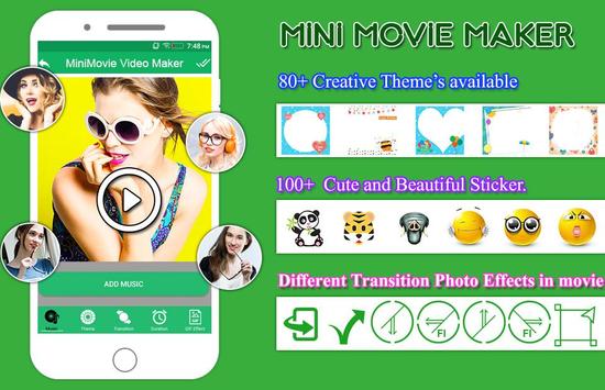 Mini Movie Video Maker application through you to create Image Slideshow from your mobile, gives seconds, with slide time, frames and filters, texture add new and different sticker’s effects.