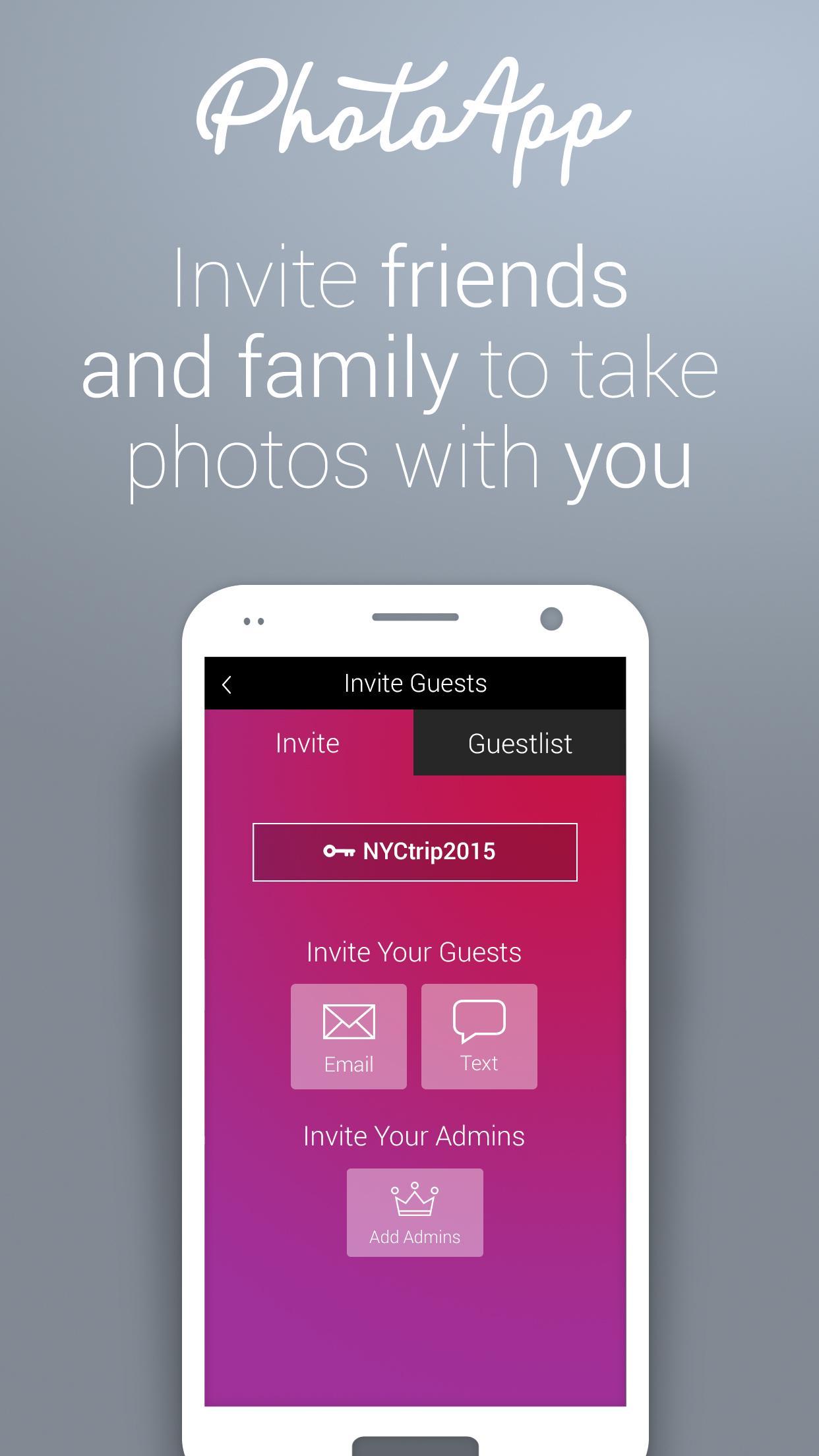 7. Easily invite your friends to PhotoApp via Text and email. It's so easy a baby can use it! It's perfect for group photo sharing at events big and small
