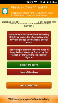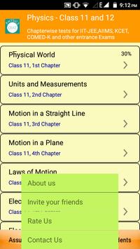 UG Engineering and Medical entrance exams such as IITJEE, AIIMS, KCET, COMED-K to name a few. The app covers chapterwise tests for class 11 and 12 Physics subject. Each test will have 10 questions, while answering the question in test, student will be given with answer for that particular question, at the end of the test students can check their test score.