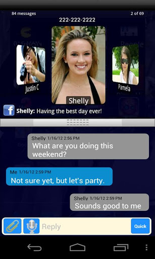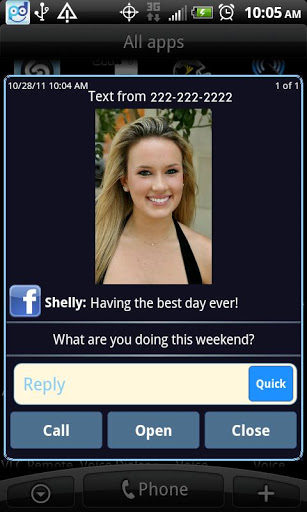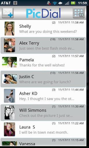 PicDial brings Facebook picture popup texting amp; FULLSCREEN calling to your phonePicDial brings Facebook picture POPUP texting and FULL SCREEN caller ID to your Android phone.Make your phone come alive by seeing your friends most recent Facebook or MySpace profile picture amp; status when they text or call you.We didnt invent Calling amp; Texting, we just made it Social.Download the PicDial application on your Android phone NOW PicDial Features Text SMS Popup Notification with Facebook photo Receive instant SMS popups with your friends profile picture and status.Includes quick reply capability.Text SMS Picture Carousel Displays your friends social network picture and status on the top half of the screen and the text thread on the bottom half.Full Screen Picture Caller ID See FULL SCREEN profile pictures amp; status messages as caller ID every time you make or receive a call.Favorite Screen Speed dial or text your friends by selecting their image from the PicDial favorite screen. Choose which picture of your friends that you want to see either social network profile pic or from your phones gallery.Crop, fix, or change any picture.Address Book backup Your contacts are automatically amp; securely backed up to the cloud at www.picdial.commy Full SMSMMS amp; group Messaging support coupled with integrated spell checking and additional message composition tools. Support for vCards contact cards allowing you increased MMS functionality. Speech to Text buttonLandscape Mode textingNOTE: you can quickly match your friends Facebook amp; MySpace pictures to your phone contacts at www.picdial.commy.Any changes you make online will be seamlessly updated on your phone.Download the PicDial application on your Android phone NOW