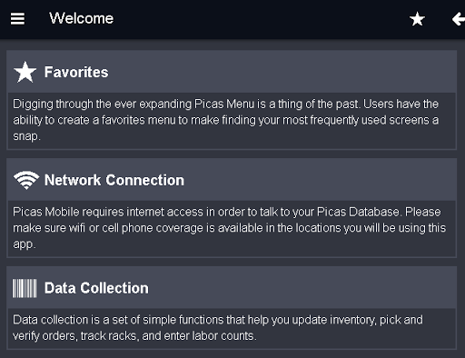 Picas Mobile allows you to have Picas on your mobile device. There are functions to enter adjustments, record inventory moves, and adjust ready dates.