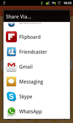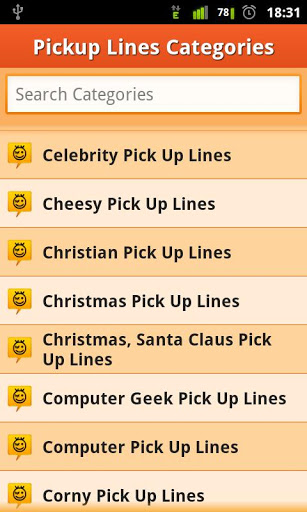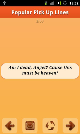 A pick up line or chat up line is a conversation starter with the aim of attracting an unfamiliar person's attention for romance, or dating. Have you ever wondered on how to get a girl/boy to like you, or on how to get a girlfriend or boyfriend, or on how to pick up girls / women, guys? All introvert girls or boys may need these pickup lines if they want to get to know someone at a park, a beach club or even at work. You never know when you may want a flirty pickup line.Sometimes a cheesy or corny pickup line can be the best thing to break the ice. The right pick up line should make even a rude person laugh or at least smile. Learn how to use these correctly and get the girl! Check out our featured lists of top and best pickup lines under cute categories like funny pickup lines, cheesy pickup lines, nerdy pickup lines, dirty pickup lines, worst pickup lines, corny pickup lines, bad pickup lines, flattering pickup lines, good pick up lines etc. Begin your flirty dating sweet talk via these crazy chat lines, now!App Features:- Wonderful smooth layout and color choice.- Offline FREE pickup lines app. No internet connection required to browse these top pickup lines, except for the first install.- 80+ of vast categories having several thousands of new & best pick up lines. This ensures that there is something sure in app, for all.- Fliuidic swipe option for previous/next chatup lines. Prev/Next arrow buttons to provided to serve the purpose.- Random button to jump to a random pick up line.- Share option, to share these best chat up lines via Watsapp, facebook twitter etc. Note:- Needed Facebook / Twitter app installed to share via Facebook / Twitter.Few of our top picks out of 80+ categories of pick up lines:- Astrology Pick up lines- Biology/Chemistry/Physics/Math Pick up lines- Celebrity chat up lines- Cheesy Pick Up Lines- Corny Pick Up Lines- Crude Humored Offensive chatlines- Cute pick up lines- Dirty Adult Jokes- Dirty Pick Up Lines- Funny Pick Up Lines- Flattering, Cheesy, Flirty pick up lines- Geeky, halo chat lines- Nerdy pick up lines- New pick up lines- Pickup lines for Girls & Women- Pick up lines for Guys- Popular pick up lines- Pick up lines for the beach- Rejecting bad pick up lines- Romantic pickup lines- Love pick up lines- Stupid Pick up lines- Suggestive top Pick up lines- Sweet pick up lines- Valentines day dating lines- Worst pick up linesCoolest app ever with romantic funny flirting lines and most wanted top pick up lines to impress all. Enjoy messaging, forwarding & texting best pickup lines, from this free dating chatlines app! This is one of the most useful free dating apps at playstore, for android phones.This app has been tested on latest devices such as Samsung Galaxy S3, S2, Samsung Galaxy Y, HTC, Galaxy Note, etc. Please email us if your device is not supported by this most popularly downloaded app.