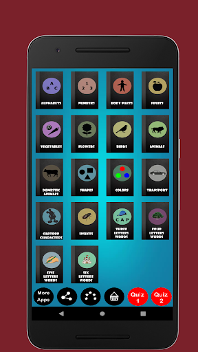 Kids can check their knowledge by playing quiz. We have added two types of quizzes like quiz by picture and quiz by spelling. In quiz by picture kids need to select the correct picture for given spelling while in quiz by spelling they need to select correct spelling for given picture.