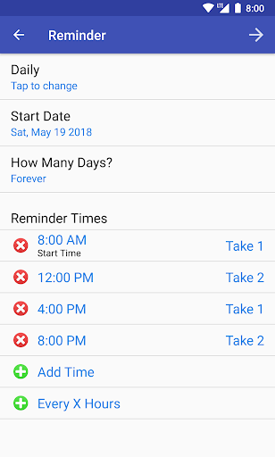 Pill Reminder - With this app you won't forget to take your medications at the right time. It's easy to use and reliable. It allows you to create any type of recurring reminders (every X hours, specific times, daily, weekly, days of the week, every X days, etc).