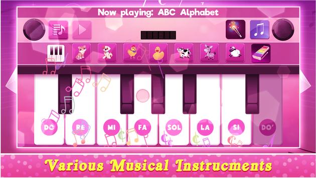 Various instruments: Piano, Xylophone, Trumpet, Guitar, Drum. Real Pink Piano - Instruments Music Kid is more amazing when there are many kinds of animal sounds: chickens, dogs, cows, ... Children will be very interested in this game.