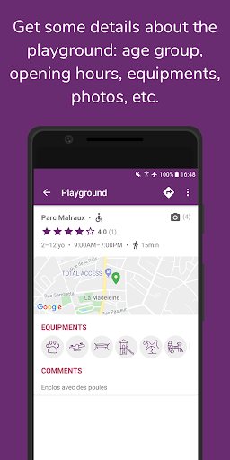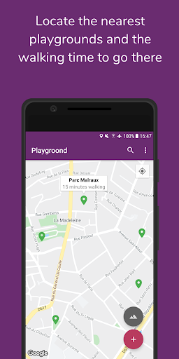 Playgroond helps you discover the playgrounds around you. The app locates you on a map and then displays playgrounds surrounding you and the walking time to go to each of them. Detailed information give you the age group, opening hours, equipments, rate, photos, etc.