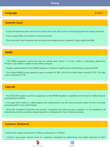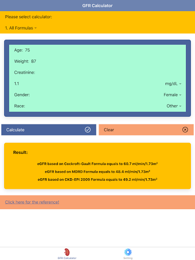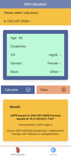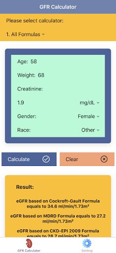 Disclaimer: all calculations must be re-checked and should not be used alone to guide patient care, nor should they substitute for clinical judgment. Calculations in this "Pocket GFR Calculator: Kidney Health & CKD Stage" app might be different with your local practice. Consult to expert doctor whenever necessary.