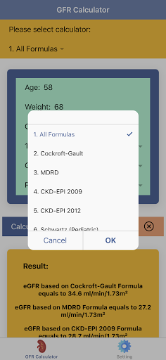 Glomerular Filtration Rate (GFR) is the amount of blood filtered by the kidney in a minute. This GFR value is an indicator of renal function, so it is used widely in diagnosis and staging of Chronic Kidney Disease (CKD). GFR is the optimal way to measure kidney function. Normal GFR varies according to age, sex, and body size. In "Pocket GFR Calculator: Kidney Health & CKD Stage", the stage of chronic kidney disease (CKD) and its management based on the eGFR values are also given. You also can use "All Formulas" feature to compare the result of several formulas for the same patient. "Pocket GFR Calculator: Kidney Health & CKD Stage" has several formulas used for GFR calculations, namely: