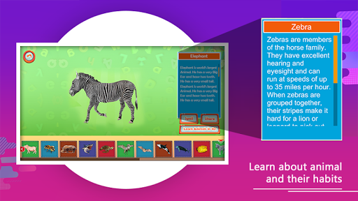 Children can enjoy zoo animals, listen to their sound and learn about their behavior and spellings of animal names.