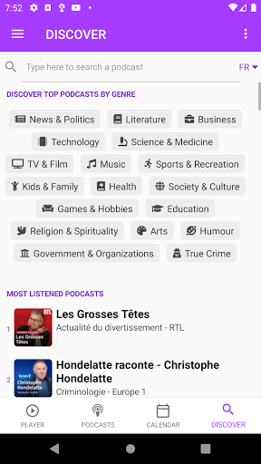 - DISCOVER podcasts by genre and browse current podcast's top 50.