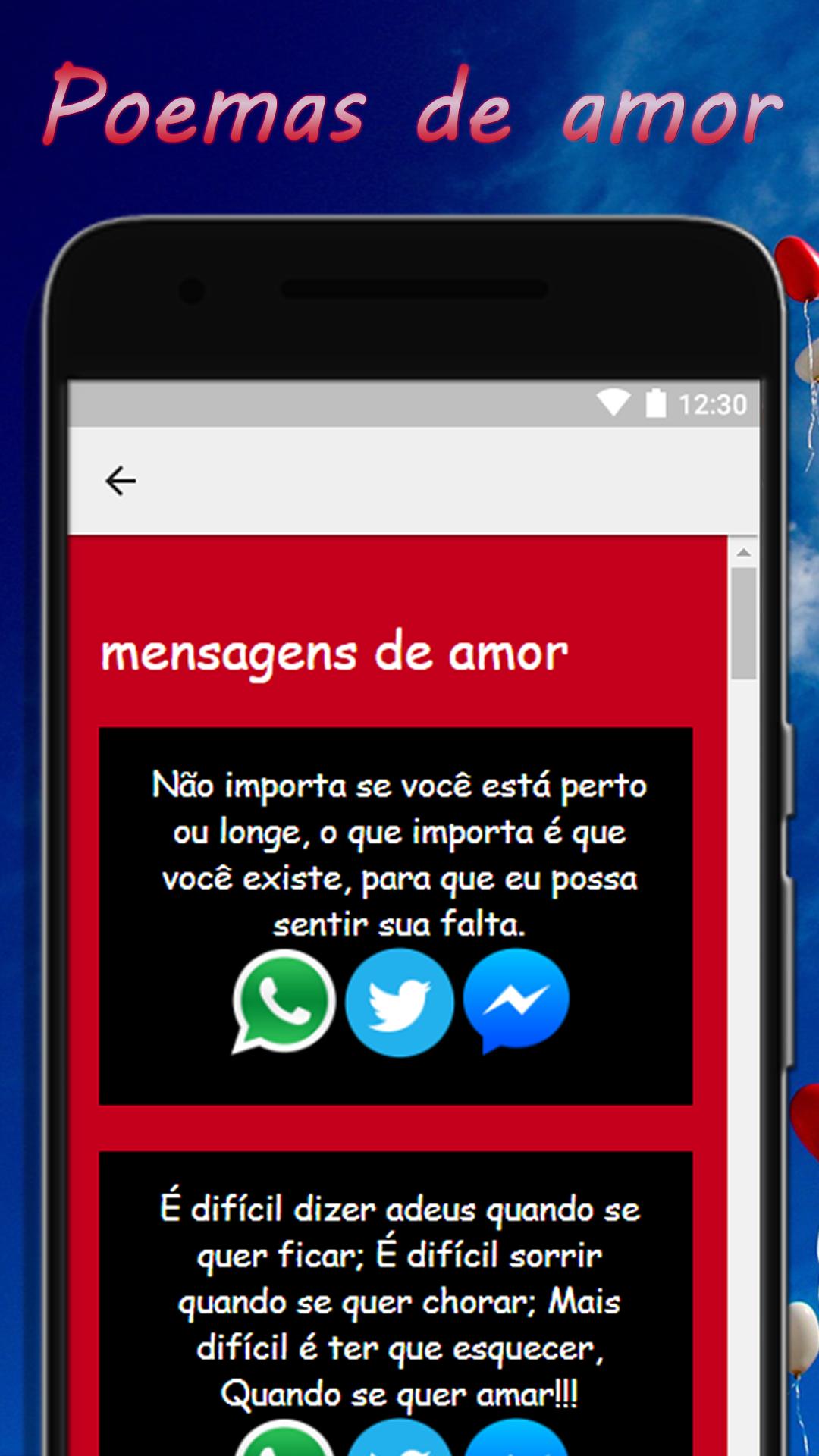 Obter seus novos e exclusivos poemas de amor aplicativo em Português para partilhar a sua whatsapp rede favorita com o melhor amor poemas, poemas e versos para cortejar uma mulher, poemas para seduzir um homem com uma seleção de poemas e poemas de amor mais bonita e romântica, para que você possa compartilhar em todas as suas redes sociais como Facebook, Messenger, Whatsapp, entre outras, compartilhar com as pessoas que você mais ama, seus amigos, familiares ou o amor de sua vida através de suas redes sociais favoritas.