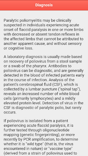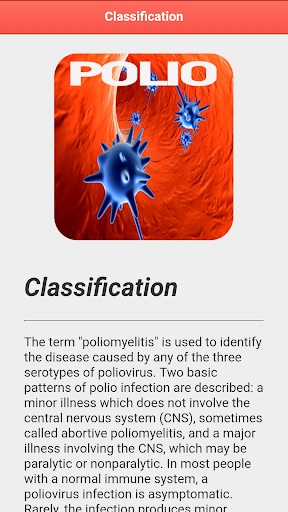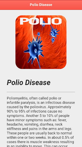 Poliomyelitis, often called polio or infantile paralysis, is an infectious disease caused by the poliovirus. In about 0.5 percent of cases there is muscle weakness resulting in an inability to move. This can occur over a few hours to a few days. The weakness most often involves the legs but may less commonly involve the muscles of the head, neck and diaphragm. Many but not all people fully recover. In those with muscle weakness about 2 to 5 percent of children and 15 to 30 percent of adults die. Another 25 percent of people have minor symptoms such as fever and a sore throat and up to 5 percent have headache, neck stiffness and pains in the arms and legs. These people are usually back to normal within one or two weeks. In up to 70 percent of infections there are no symptoms. Years after recovery post-polio syndrome may occur, with a slow development of muscle weakness similar to that which the person had during the initial infection. Poliovirus is usually spread from person to person through infected fecal matter entering the mouth. It may also be spread by food or water containing human feces and less commonly from infected saliva. Those who are infected may spread the disease for up to six weeks even if no symptoms are present. The disease may be diagnosed by finding the virus in the feces or detecting antibodies against it in the blood. The disease only occurs naturally in humans.