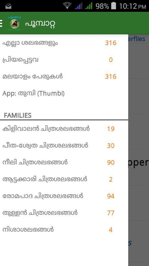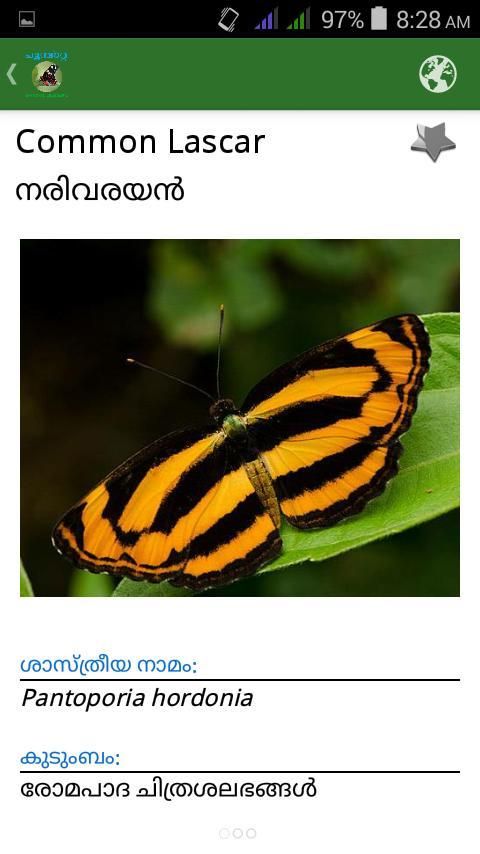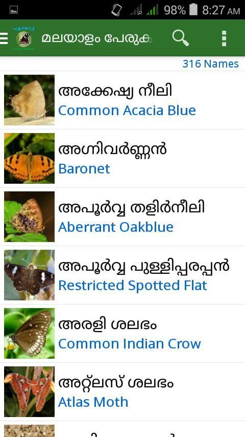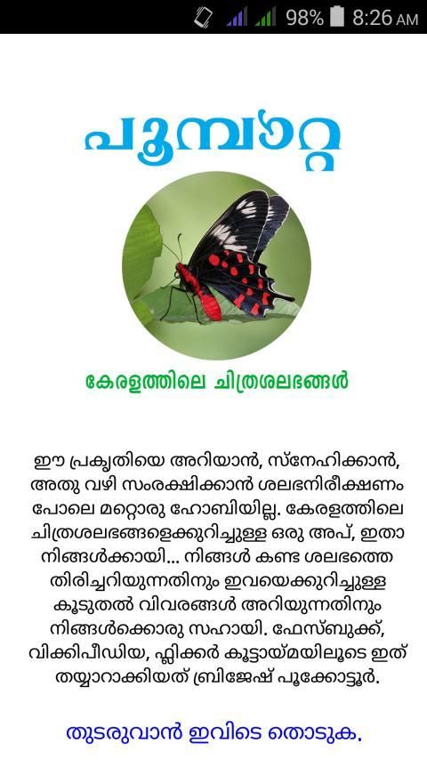 This is the first ever application build for Butterfly lovers in Malayalam Language. It works in offline mode. Current version included 320 butterflies and moths found in Kerala and Southern India. It can be used as a field guide at butterflying sites.