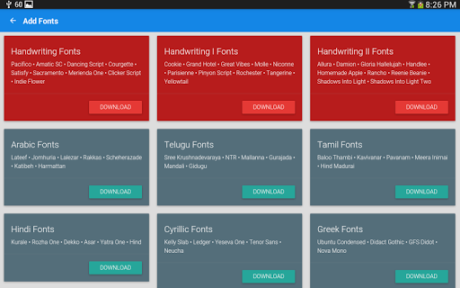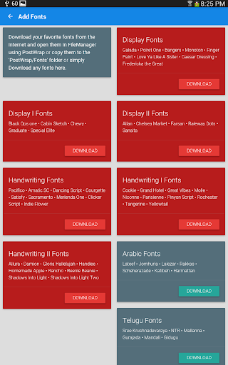 The app comes with limited number of fonts to keep the app size to a minimum and to avoid copyright issues. But that does not stop you from using the fonts you like. Just download the fonts you like and open them using PostWrap (or you could drop your fonts in the 'PostWrap/Fonts' folder). If that sounds too much, we provide option to download fonts from within the app itself.