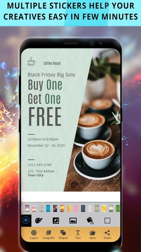 Create promotional posters, advertisement, offer announcements, cover photos on the go with amazing backgrounds, texture, effects, fonts, sticker and get the attention you want.