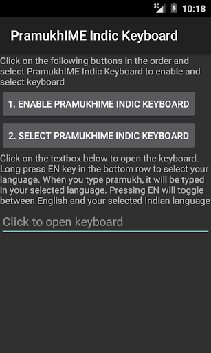 Look for "PramukhIME Indic Keyboard" app in your phone and open it up. Click on "1. Enable PramukhIME Indic Keyboard" button which will open up "Language and Input" settings window. Check "PramukhIME Indic Keyboard" and come back. Click on "2. Select PramukhIME Indic Keyboard", select "PramukhIME Indic Keyboard" and come back.
