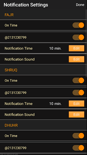 - islamic prayer times alerts can be configurabale seperately for fajr prayer, shuruq prayer, dhuhr prayer, asr prayer, magrib prayer and isha prayer.