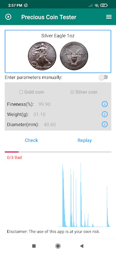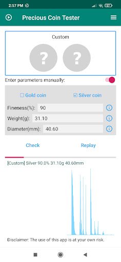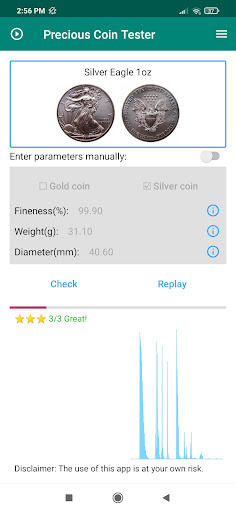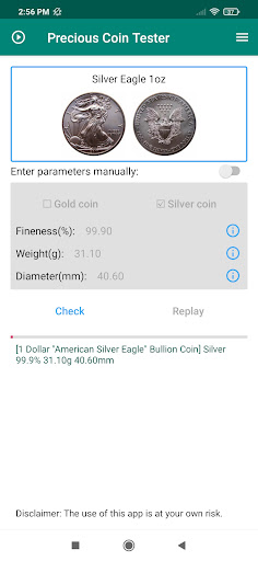 Precious coin tester helps you listen to the sound generated by the ping test and will tell you whether the coin is a cheap metal fake*. So no more worry about the fake gold or silver coin!
