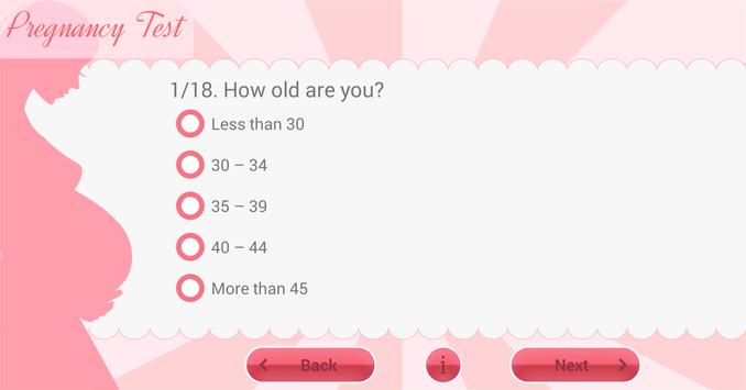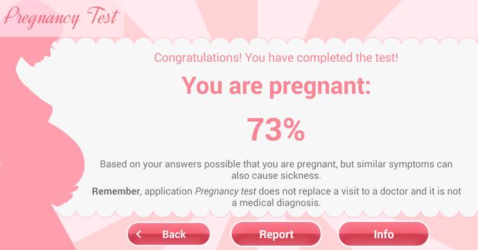 Do you think that you are pregnant? Do you get first symptoms of pregnancy? This application will help you to answer of these questions. Application analyzes answers and determines the probability of pregnancy. Each response contains an additional comment, which will allow you to improve your knowledge about occurring symptoms.
