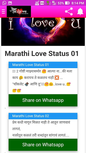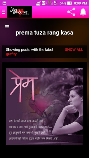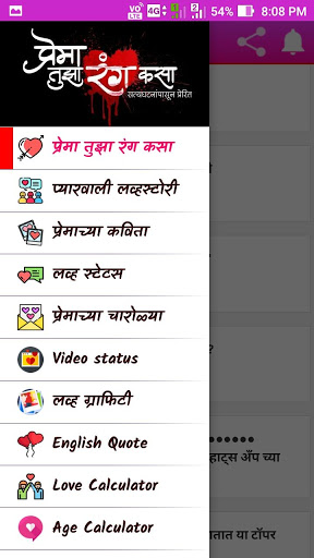 Prema Tuza Rang Kasa is one of the best marathi love android app. The app contains following contents.
