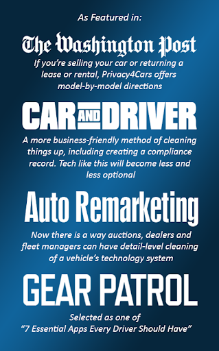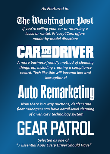 Quickly & intuitively delete the Nonpublic Personal Information vehicles increasingly capture while building records to demonstrate compliance with privacy, security, and data retention laws and regulations. Protect the reputation of your business and avoid expensive fines and lawsuits! PRIVACY4CARS is a recognized leader in the vehicle privacy technology space: our patented solution was featured in 100+ media outlets, including: