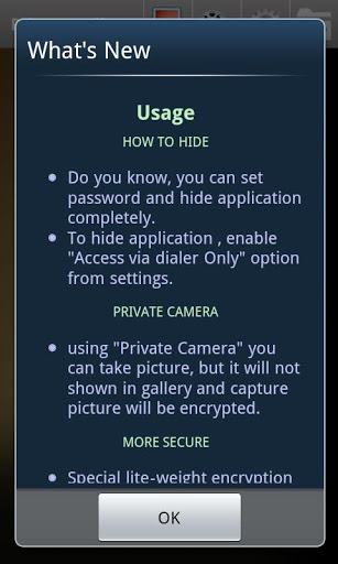 protect your pictures using very fast and secure ENCRYPTION algorithm. No any icon in application list. You can easily open the app using phone dialer by dialing you secretpassword.Not a single app in market doing encryptiondecryption on imagevideo.BuiltIn private Camera allows you to take pictures and store in Private Gallery. HOW TO hide Do you know, you can set password and hide application completely. To hide application , enable quot;Access via dialer Onlyquot; option from settings. PRIVATE CAMERA using quot;Private Cameraquot; you can take picture, but it will not shown in gallery and capture picture will be encrypted. MORE SECURE Special liteweight encryption algorithms for media. it not just file renaming like other application. No buddy can see your media files even have full access of your SDCARD or PHONE Default Max file size of video set to 100MB, you can change from settings. Hide photo or video in very secure manner. Easy to use Hide multiple videophoto in single selection. Manage your photos in folders. Easy share from native gallery to quot;Private Galleryquot; Real file encryption which give 100 SECURITY.This free app is ad supported and may contain ads in the notification tray andor home screen.PT: Vault, Vaulty, PhotoVault, VideoVault, hide pictures, privacy space, privacy gallery 3d, Gallery3D, Vault, private photo gallery, Vaulty free, Photo Safe, Gallery lock Lite, Privacy Gallery, File Cover, HideNSeek, Stealth Gallery, Kii Vault, like Vaulty,Keep Safe,PicSafe, Picture Safe for Android, Privacy, Security, Hide videos, Picture privacy, Vault, Hide Photos, Gallery Lock, kii safe,Keep Safe,Photo SafePS, iLock Pro, Hide Photos etc